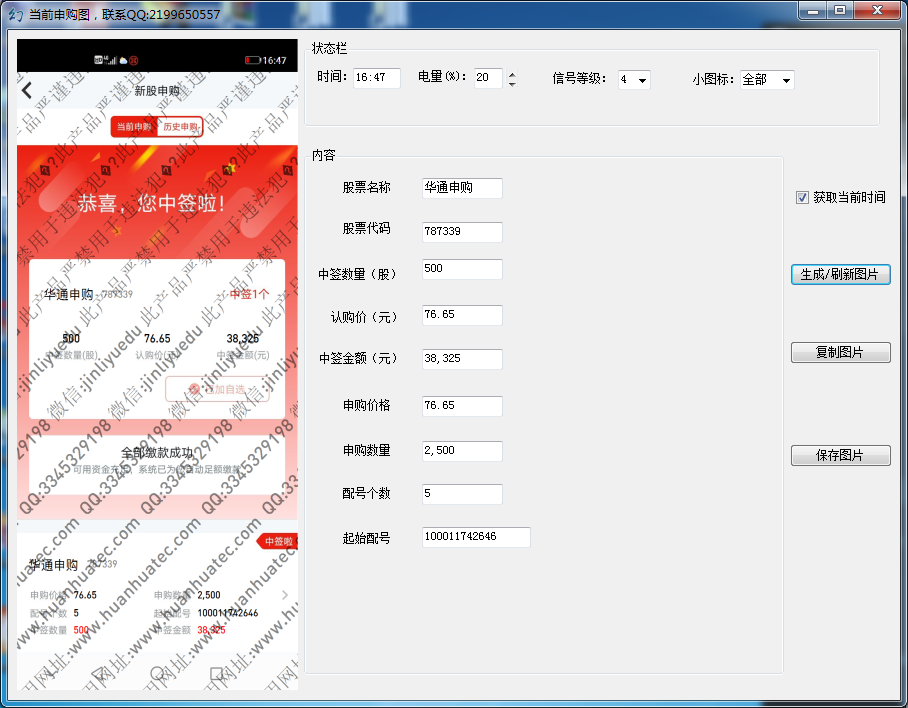 新股申购截图生成器,共4个界面随时供您使用,含新股申购、当前申购、中签、历史申购截图。图片清晰、方便快捷。电脑使用,随时生成。