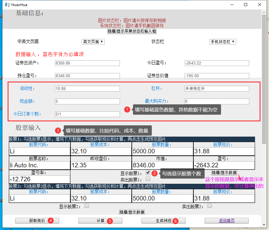 3.每个勾选的股票输入框中,输入股票代码、持仓股数、成本、可用,点击获取现价、计算按钮,自动获取计算盈亏等数值